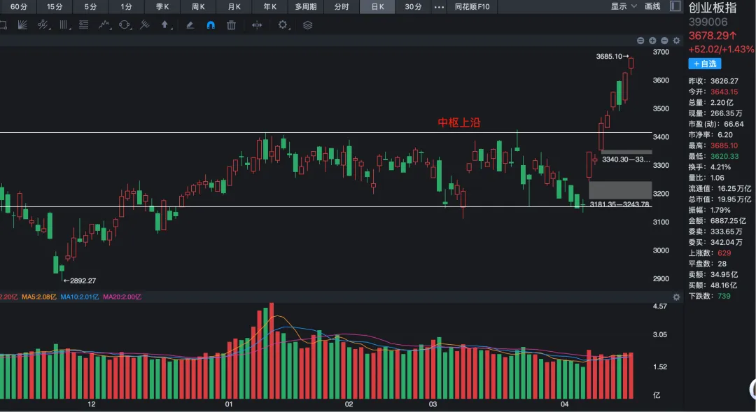 自4月10日突破中枢上沿后,创业板走出了一波加速拉升,目前涨幅偏高,且始终没有出现过一次像样的回调,风险也在逐步积累。
