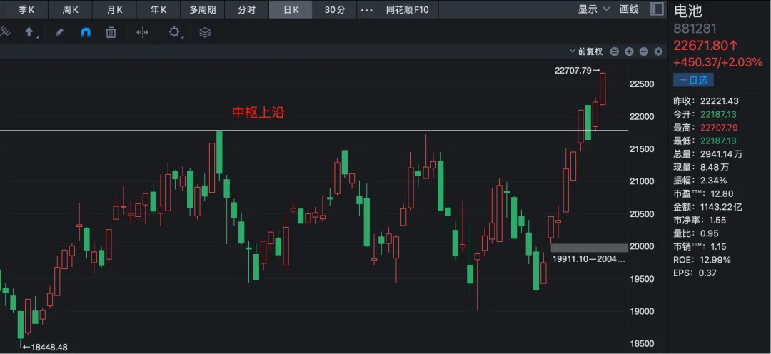电池板块在突破中枢上沿后回踩确认,随后再度向上突破,貌似出现突破有效的信号了。