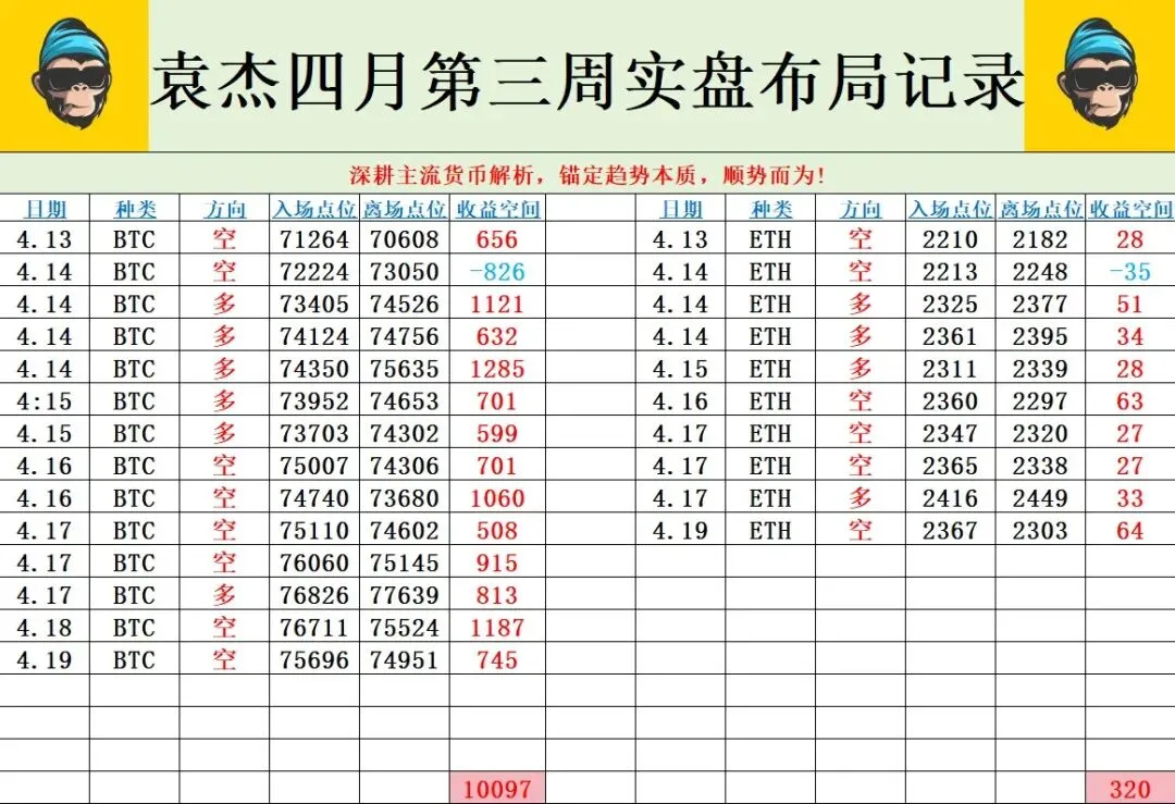 周内的布局始终围绕结构变化展开,而不是情绪驱动。震荡阶段不盲目追趋势,而是在区间内做节奏,反复吃波动;当行情出现明显加速信号时顺势跟进,把握多头释放出来的空间;而在冲高出现乏力、承接不足时,迅速切换思路参与高位回落。这种来回切换的过程中并不是没有损失,但每一次回撤都被控制在可承受范围内,关键在于没有让错误扩大。最终大饼累计拿下10097点空间,以太累计320点,这种结果并不是某一笔交易的运气,而是持续执行带来的叠加效应。市场不会因为你看懂而给你结果,只会因为你是否真正去执行而给出反馈,很多人困在原地,并不是缺少判断,而是始终停在“再看看”的那一步。