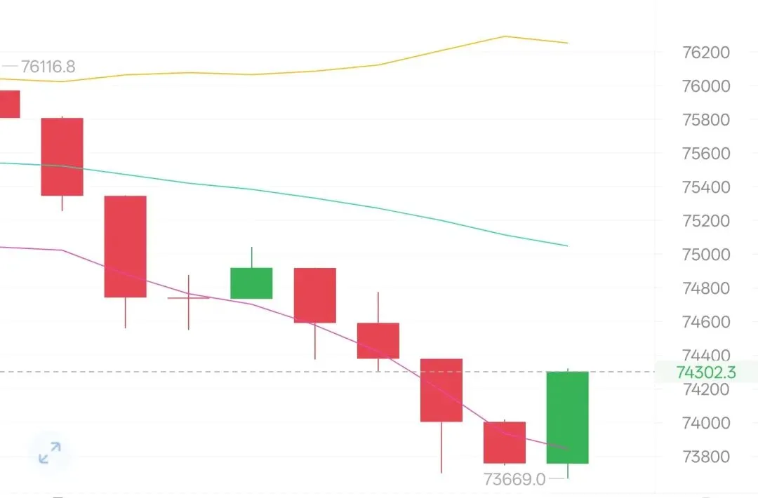 凌晨那波砸盘把价格直接打到73669 一线,随后马上被拉起,说明下方还是有承接的。现在这根四小时K线是在下轨附近往上修,属于空头释放一波后的反抽。但要注意,价格还在4小时中轨下方,前面跌下来的结构并没有收回,所以大方向暂时还是偏弱,只能先看修复,不能太早说转强。一小时这边更直观,连续阴线下压后,当前走出一根明显反抽K线,说明短线杀跌节奏放缓,盘面开始修复。大白话讲就是:空头砸了一波,低位有人接,现在先走反弹,但反弹空间先别看太大。 只要 73650 不再被有效跌破,短线还有继续往上试压的机会;但上面一到压力区,还是要防二次回落。思路上,现阶段不建议低位再追空,先看反弹修复。