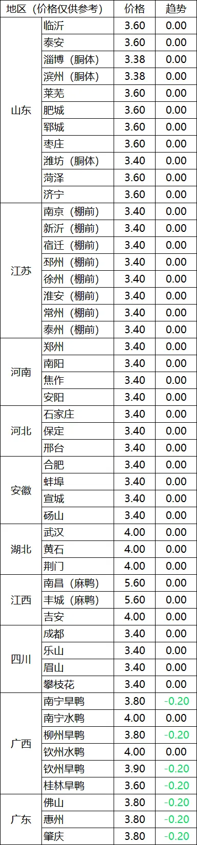 泰安地区肉毛鸡棚前收购价3.65-3.75元/斤,与19日相比持平;