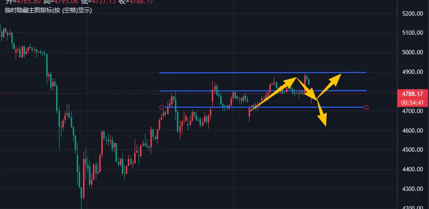 今日多空抉择上,我更偏向抄底。原本计划抄顶做空,但上周五未给到机会,且双休已提示4750附近及下方可阶段性抄底,因此倾向看反弹,核心逻辑有三点: