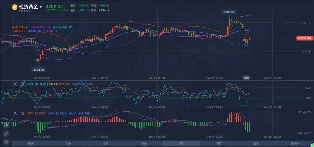 当前价格为4782.04,日内跌幅-1.08%,盘中最低触及4737.13,最高4795.06,整体呈现震荡下行格局。以下为日内技术分析与交易策略: