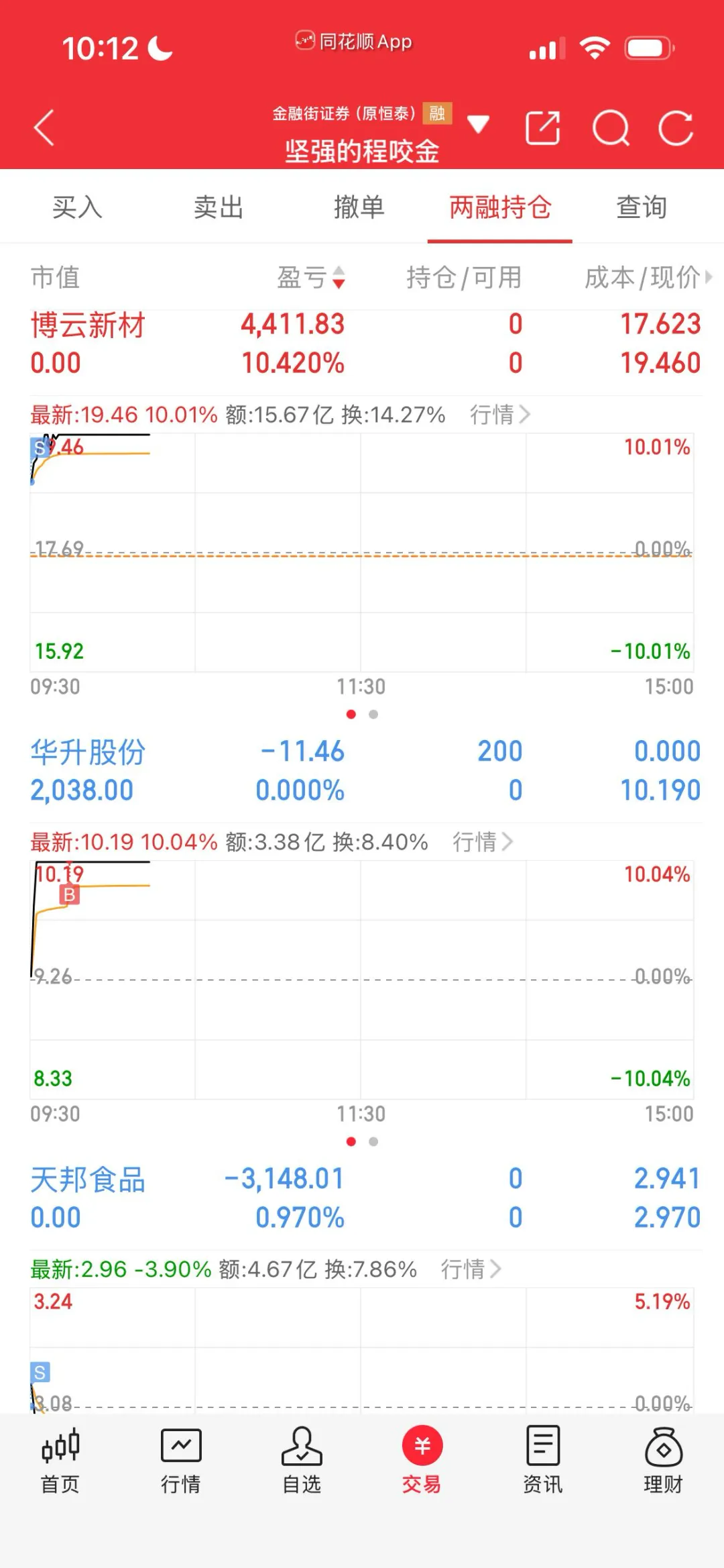 博云低个身位,是完全看圣阳脸色的,所以我每天都是竞价出每天都在卖飞,今天实在不想再接回来了,看了会儿觉得实在踏空感太强,正好这时华升开了,想着搞个半仓吧,操作失误把按手数下单看成了按金额下单,买完一看才买了一点点,算了就这样吧,本来就是踏空后去做的勉强票,本就不该做的。