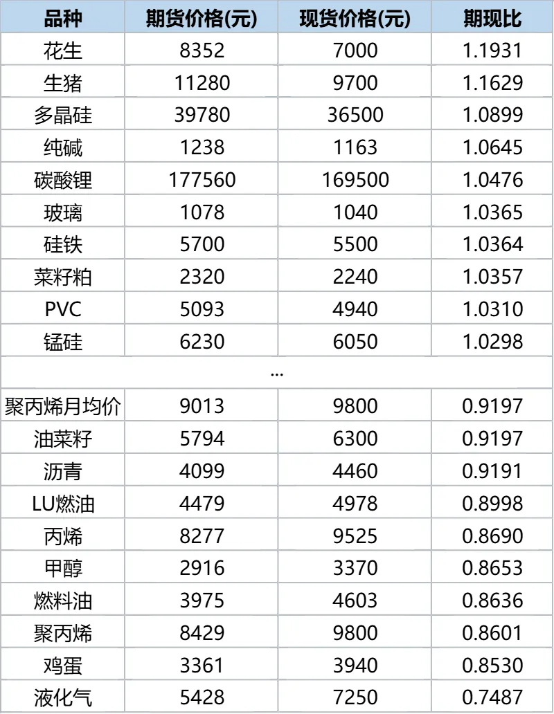 说明:期现比=期货主力合约价格/现货价格,大于1为期货升水,小于1为期货贴水。
