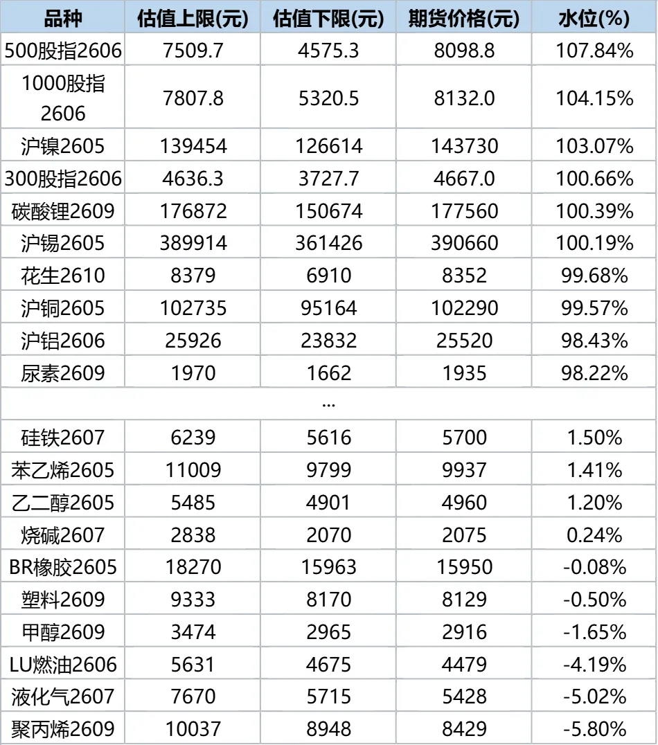 说明:估值上限、估值下限数据采自文华财经的多因子估值数据库,价格水位= 当前期货价格/估值数据,价格水位处于0值附近代表当前期货价格处于低位;价格水位处于100%附近代表当前期货价格处于高位。