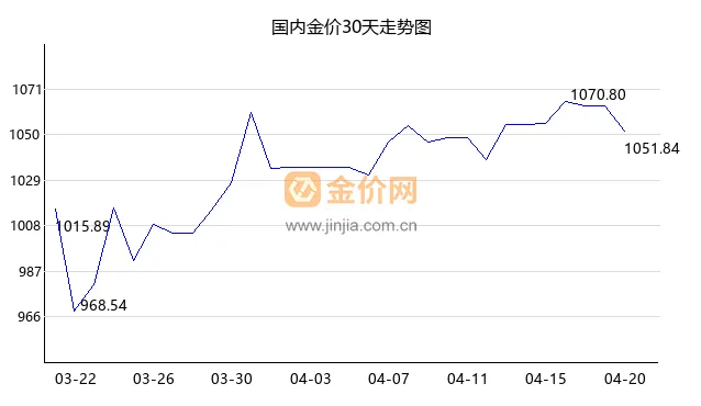 今日国内金价下跌,现价1051.84 元/克,下跌-0.05%,今日开盘价1054.00,最高价1070.80,最低价1045.00。