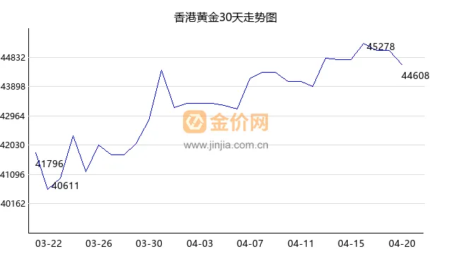 今日香港黄金下跌,现价44608 港币/两,今日开盘价44580,最高价44786,最低价44061。