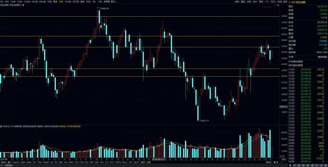 恒生指数月线图,22000-《23200-27000-28800-》32000。月结构图表上主运行区域在23200-28800之间,27000为强弱平衡点。