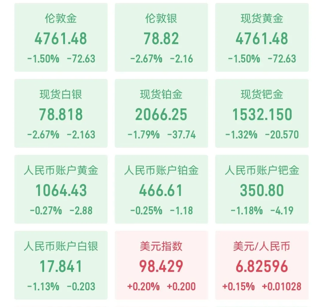 4月20日早盘由于特朗普释放的乐观信息在周末被伊朗逐一驳斥,美元及WTI原跳空高开高走,黄金、白银开盘大幅下挫,现货黄金低开至4760美元/盎司,跌幅超1.5%,白银跌破80美元,跌幅超2%。