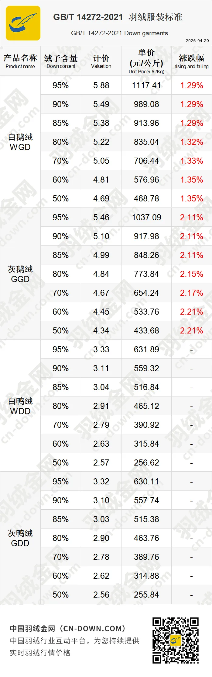 白鹅绒、灰鹅绒计价上涨,白鸭绒、灰鸭绒持平