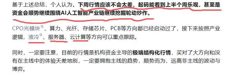 要么去做延续,比如CPO光模块等方向,要么去做发散,比如近期还没有炒过,但是也是AI大方向的核心细分方向,比如液冷、服务器、云计算等。
