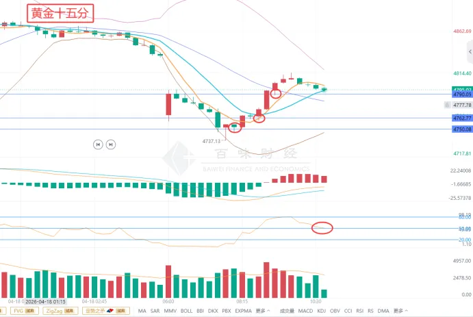回到技术面。指标上显示,现在95这个位置也是很不错的。为什么是95?从今天的低点4736到当前高点4814画黄金分割,0.382的回调位在4784附近,0.5在4775,0.618在4766。而95也就是4795,接近0.236的浅回调位。这个位置之所以值得关注,是因为市场自发性调节的回调支撑就是在95附近——它不是由单一斐波那契决定的,而是由盘中多次测试形成的共识区域。从十五分钟图上看,价格从4814回落后,在95附近出现了明显的停顿和小的反弹,说明这里有买盘在承接。如果后续价格能够回踩95并且守住,那么可以继续接多看涨,目标先看4830的缺口位置,再看更高的4850-4870。