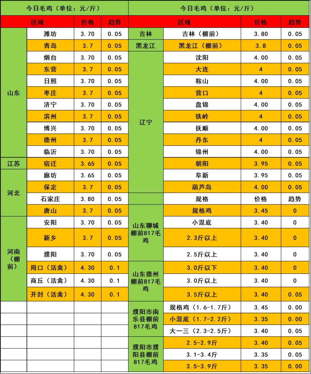 注:各地毛鸡以实际成交为准,其中活禽交易价格差异大。实际局部根据产品行情、消费、毛鸡出栏现状分析,实际收购价格与报价有一定差距,价格只供参考。