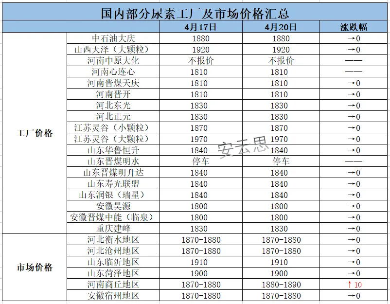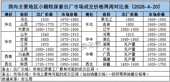 东北地区:东北地区农业需求继续减小,目前辽宁和吉林地区农业需求结束,黑龙江农业需求中部地区结束,北部地区仍有需求,预计5月上旬进入收尾阶段,区域内中小颗粒尿素主流出厂价格在1840-1880元/吨,主流市场价格在1860-1900元/吨,大颗粒尿素不报价,主要发联储联销,主流市场价格在2080-2170元/吨。