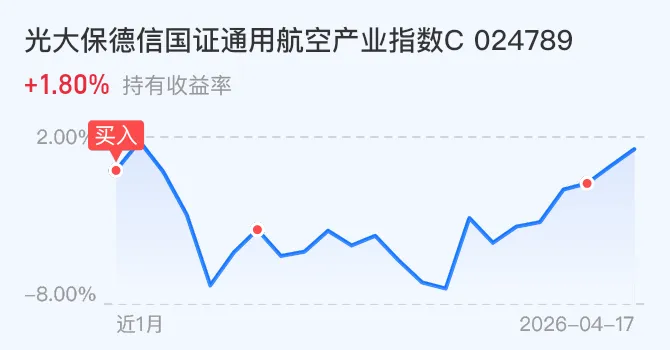 加仓$光大保德信国证通用航空产业指数C$,金额5000元,通用航空与低空经济近期政策利好密集释放,国资委召开低空经济专题推进会,明确央企加大产业布局,新民用航空法7月正式实施,空域管理、飞行审批全面优化。各地低空试点扩容、无人机物流、飞行汽车项目持续落地,产业从概念迈入规模化发展阶段。板块近期震荡上行,产业链成长空间广阔。基金全面覆盖航空制造、低空装备、航天配套细分龙头,政策催化不断、产业落地提速,我当下阶段顺势加仓,把握新质生产力赛道的中长期成长红利。