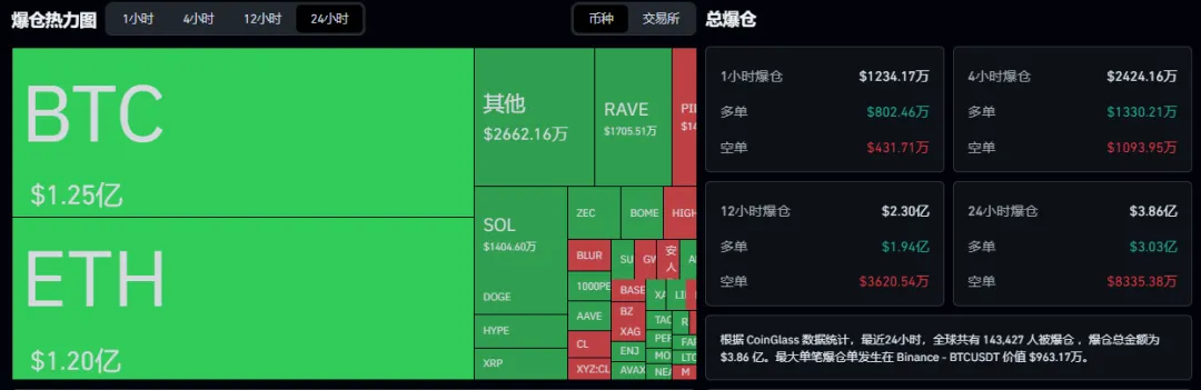 过去24小时全网共有143,427人被被爆仓,爆仓总金额为$3.86亿美元,多单爆仓3.03亿美元,空单爆仓8335.38万美元。📊 主流币表现: