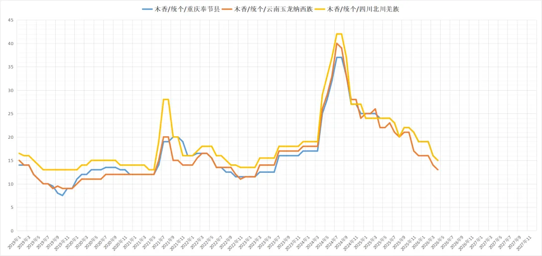 产地可供货源不丰,近阶段有商家采购,货源小批量交易顺畅,持货商家惜售心理增加,现开片货价格在14-14.5元,药厂货13元,小木香9元左右。