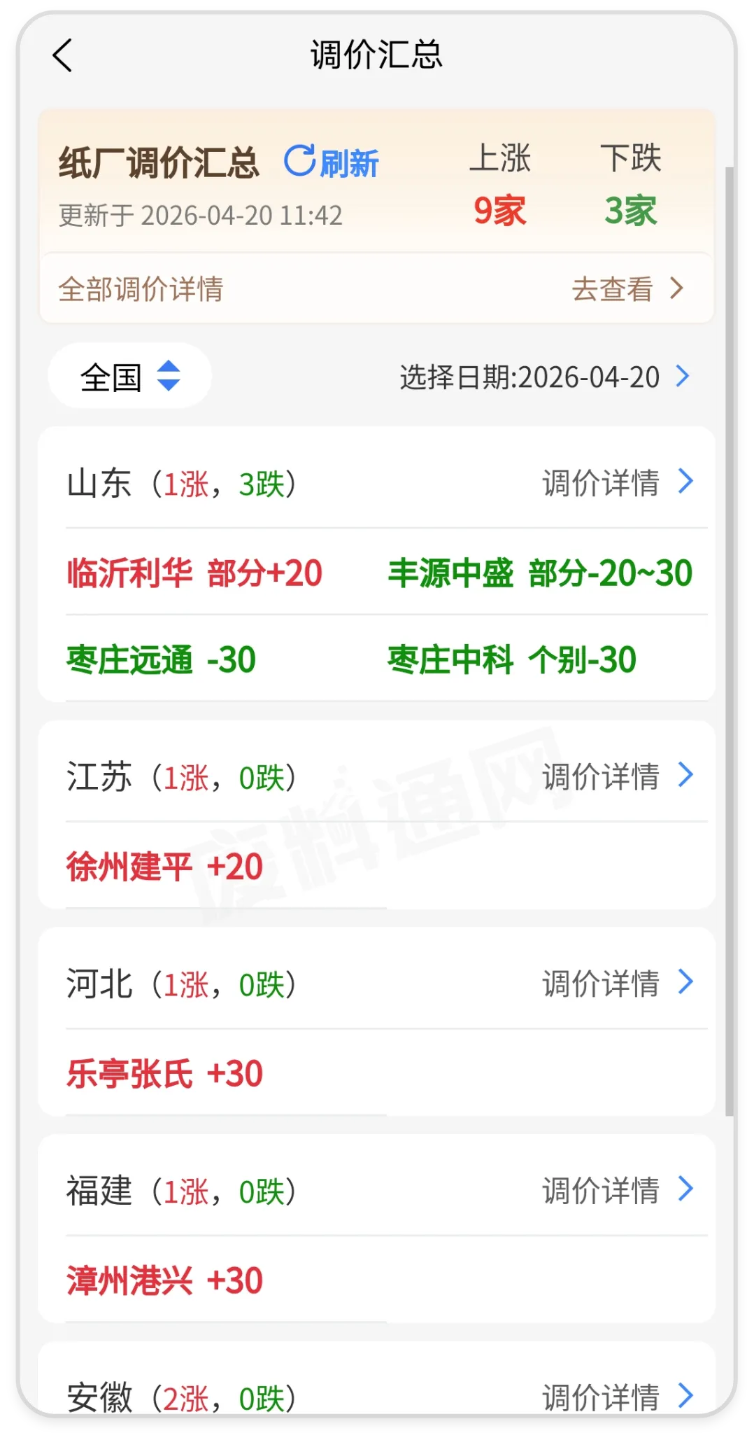4月20日起,安徽【宿州山鹰】纸业,AA、A、边角料上调20元/吨。调整后执行到厂价(不含税价):AA级1770元/吨;边角料1740元/吨;A级1750元/吨;B级1680元/吨;C级1650元/吨;D级1600元/吨;三级纸1630元/吨;花纸1540元/吨;纸芯管920元/吨。