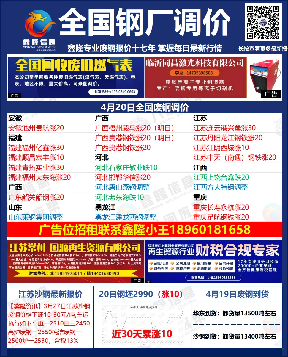 【鑫隆资讯】4月20日河北邯郸华信废钢涨20:钢筋头2390冲豆铁饼2390钢板料2390火车小料2360模具钢纯道轨U型钢2360工角槽板料2240-2340马蹄铁2240-2290钢筋压块2320不含税