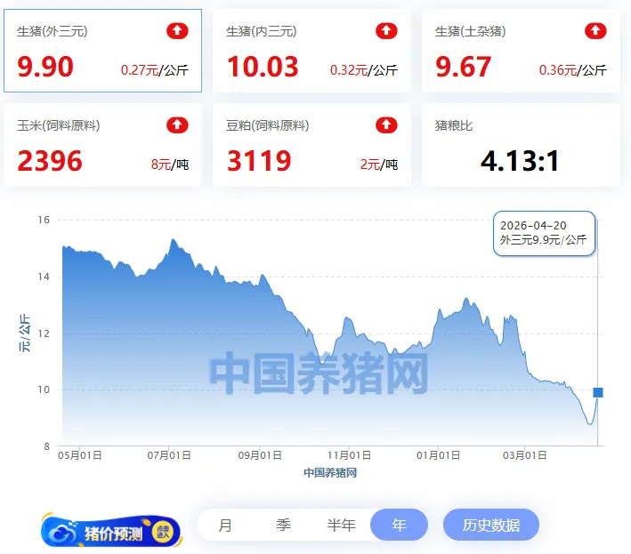 2026年4月20日全国外三元均价9.9元/公斤,今日猪价较昨日报价上涨了0.27元/公斤。