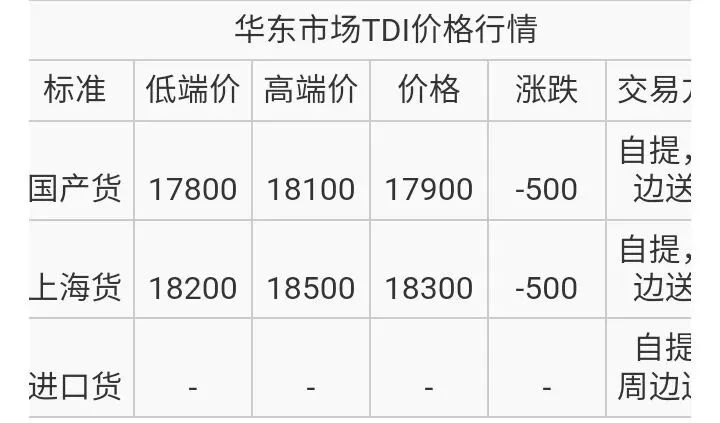 华东TDI国产货价格在17800-18100元/吨;上海货价格在18200-18500元/吨附近。