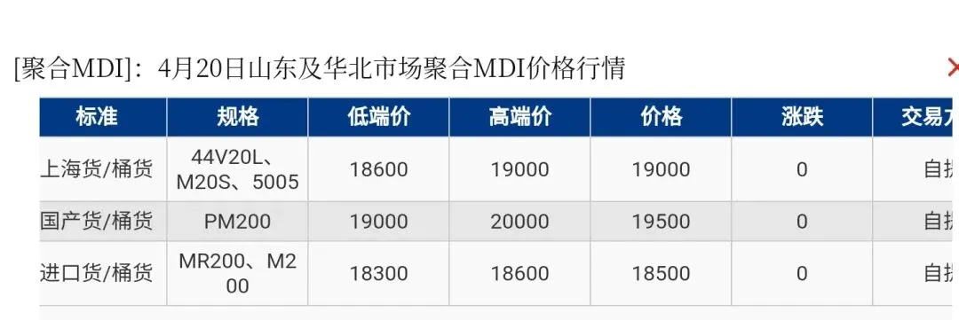 山东及华北区域聚合MDI上海货报盘18600-19000元/吨,国产货(PM200)报盘19000-20000元/吨,进口货报盘18300-18600元/吨。