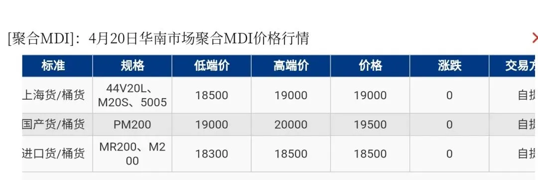 华南区域聚合MDI上海货报盘18500-19000元/吨,国产货(PM200)报盘19000-20000元/吨,进口货报盘18300-18500元/吨。