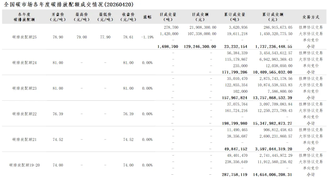 当前位置:首页>行情>【CEA】全国碳市场每日综合价格行情及成交信息20260420