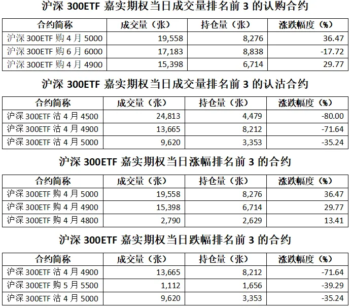 沪深300ETF嘉实期权总成交面额83.53亿元,增加3.16%,期现成交比为0.01,权利金成交额0.56亿元;期权总成交量166,306张,增加5.75%,其中认购期权成交量94,019张,认沽期权成交量72,287张,认沽认购成交比率为0.77(上一交易日认沽认购成交比率为0.44)。
