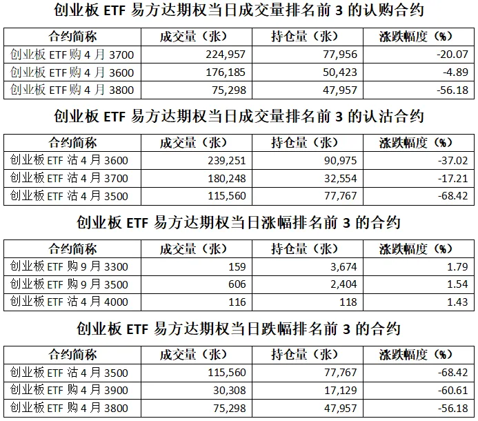 创业板ETF易方达期权总成交面额740.25亿元,减少20.17%,期现成交比为0.26,权利金成交额12.71亿元;期权总成交量2,082,012张,减少20.61%,其中认购期权成交量978,883张,认沽期权成交量1,103,129张,认沽认购成交比率为1.13(上一交易日认沽认购成交比率为0.97)。