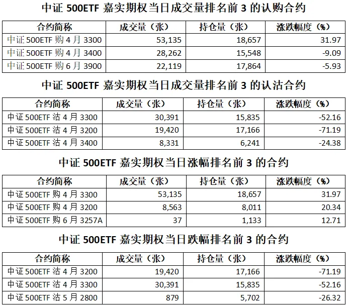 中证500ETF嘉实期权总成交面额97.61亿元,增加4.87%,期现成交比为0.02,权利金成交额1.15亿元;期权总成交量289,892张,增加1.02%,其中认购期权成交量187,573张,认沽期权成交量102,319张,认沽认购成交比率为0.55(上一交易日认沽认购成交比率为0.89)。