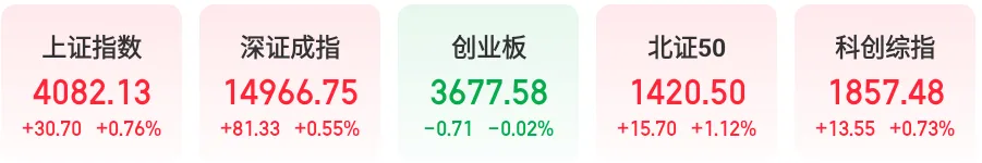 截至收盘,沪指涨0.76%,深成指涨0.55%,创业板指跌0.02%。