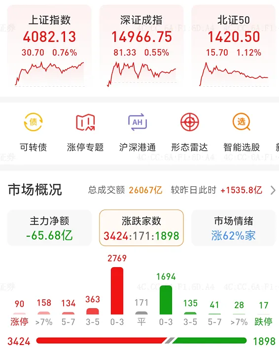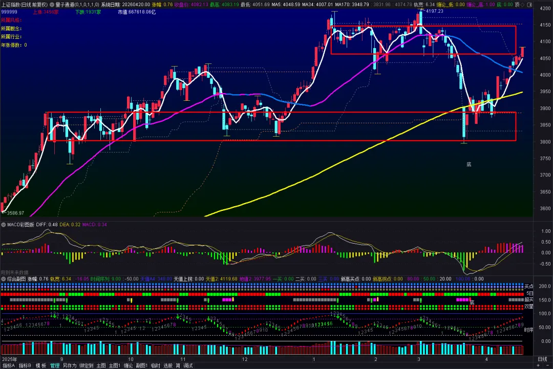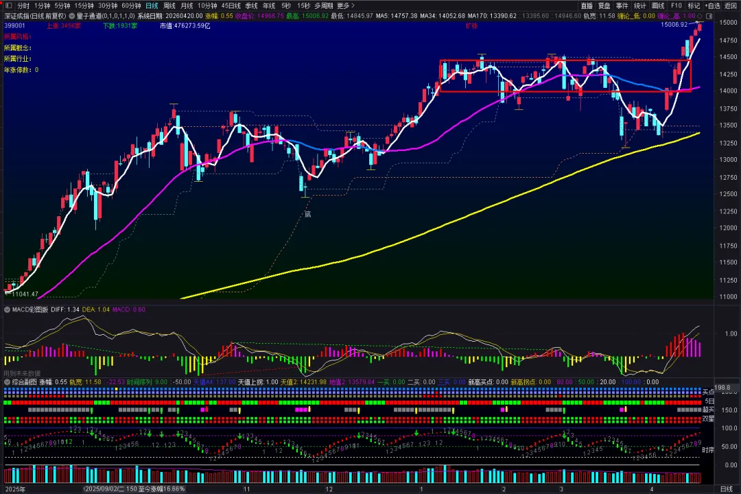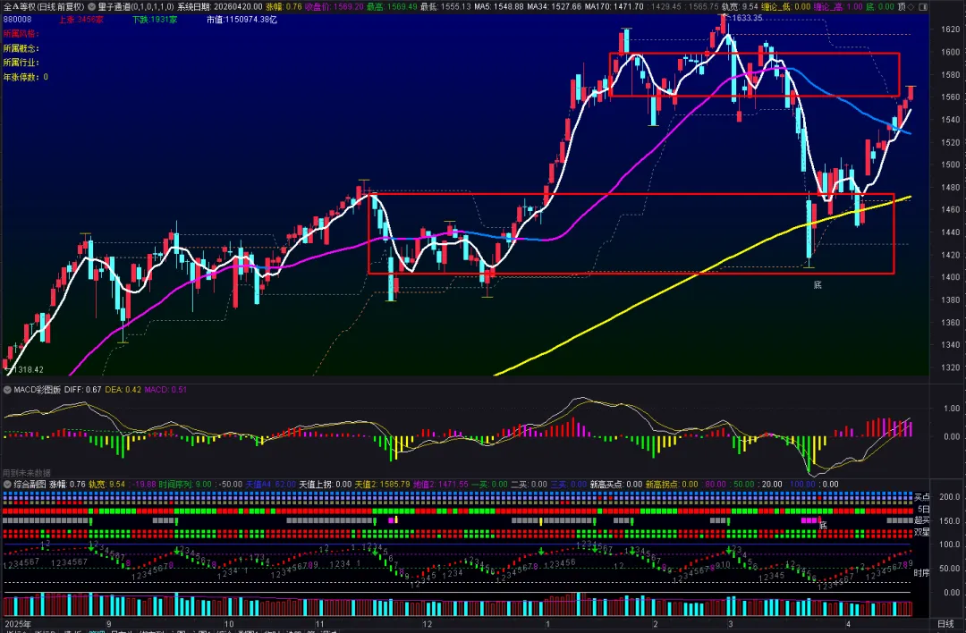 上证指数今日收涨0.76%,开始进入上方箱体区域,目前时间序列上升9,并且没有拐头的迹象,所以这里判断变盘期失效,预期会到箱体顶部; 深指今日收涨0.55%,继续创新高的日拱一卒,这种情况就准备纠错了,然后随时做好跑的准备哈;全A等权指数,今日收涨0.76%,今天大家涨得比较平均,但就是在慢慢往上走;今日的走势有点出乎意料的强,周末关于中东局势的消息一再反转,最后是以伊朗重新封锁海峡告终,大家以为市场会不太好,叠加这里短期内已经强势反弹了,结果今天继续放量上涨,这就是逼空行情了,会让人很不舒服,但没办法,逼空后可能还会有一次快速回调,但可以先纠错上车先,深指不断创新高会带来安全空间,未开上证涨到前高回踩,而深指则是回踩确认,正如上篇文章中分析,从周级别角度指标已经修复,那么接下来是积极看多为主;