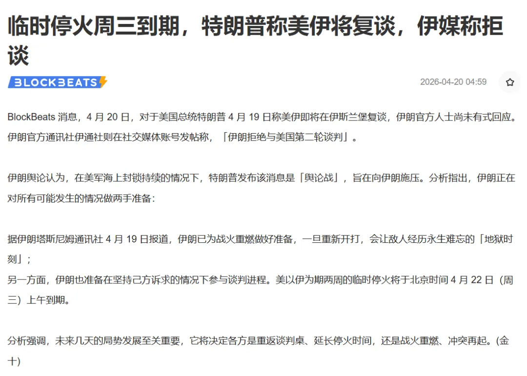 时间点也很关键,这周三是停火协议的节点。如果到期谈崩,局势重新升级,油价大概率继续往上冲,美元走强,风险资产会承压,BTC这边不排除来一波快速下杀,这算是短线比较明确的利空。