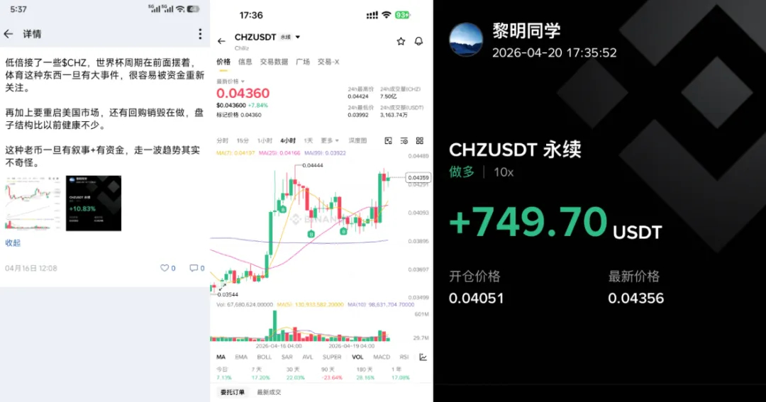前几天同步到朋友圈的策略,低倍分批接一些CHZ,世界杯快到了,CHZ作为体育板块的龙头肯定是要启动的,现在已经开始往上发力了