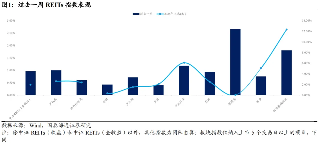 从底层资产来看,过去一周各板块整体上涨,其中保障房和新型基础设施板块REITs涨幅较高。