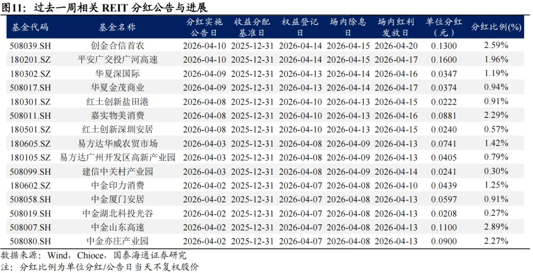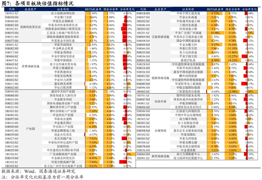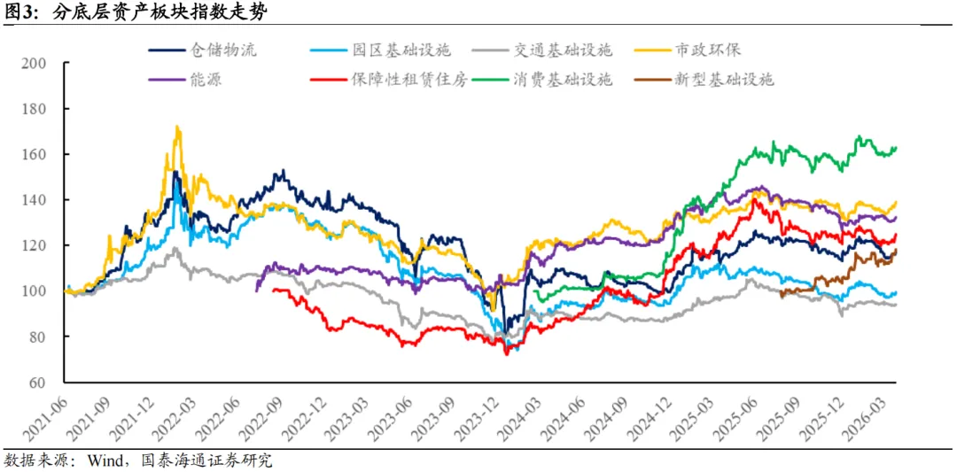具体来看,涨跌幅由高到低分别为:保障房(2.66%)、新型基础设施(1.80%)、市政环保(1.18%)、能源(0.94%)、消费(0.75%)、产业园(0.71%)、仓储(0.43%)、交通(0.40%)。