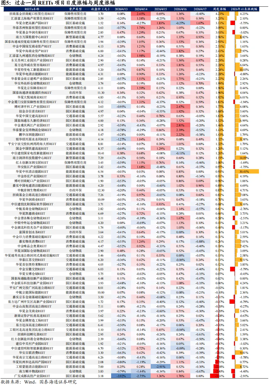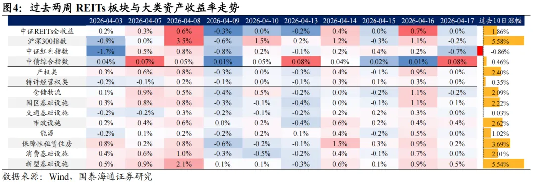 过去一周(2026年4月10日-2026年4月17日,下同)REITs指数整体上行,其中保障房和新型基础设施板块REITs涨幅较高