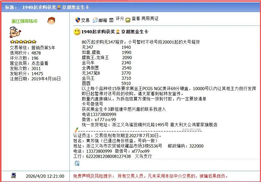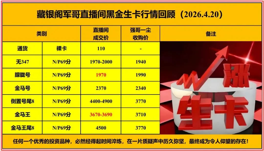 >2026年4月20日获奖纪念黑金生卡行情播报