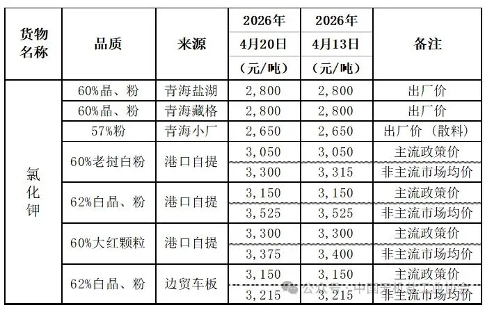 本周国产大厂氯化钾60%粉、晶出厂价为:青海盐湖和青海藏格2,800元/吨,与上周持平;青海小厂57%粉(散料)前期出厂均价2,650元/吨,与上周持平。港口60%老挝白粉自提主流政策价3,050元/吨,与上周持平;非主流市场均价3,300元/吨,较上周降15元/吨。