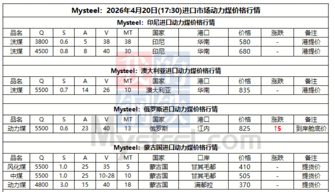 20日进口市场动力煤暂稳运行,海外矿山报盘方面,现印尼Q3800大船FOB主流报价在62-63美元/吨,澳煤Q5500大船FOB报价89-90美元/吨,俄煤Q5500大船CFR报价多在98美元/吨。现阶段进口煤价呈现分化态势,俄、澳等进口高卡煤现阶段受海运费上涨影响,加之矿方挺价情绪仍在,部分货盘回国出现倒挂现象;低卡印尼煤则因DMO及雨季影响,市场资源流通情况一般,矿方报价维持坚挺。国内市场方面,终端用户在库存乐观下主动补库积极性不强,压价现象仍较为普遍,市场成交表现冷清。预计短期内进口煤价格或将以稳为主,后续需关注外矿最新报价。