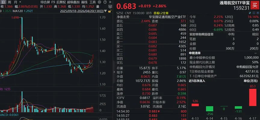 市场热点仍然聚焦商业航天,一键布局商业航天+卫星导航+低空经济+大飞机的通用航空ETF华宝(159231)场内一度冲高3%,最终收涨2.86%强势七连涨,站上60日线,单日实时申购300万份。