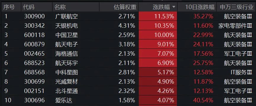 指数成份股方面,八成成份股飘红,航空、航天装备涨幅居前。广联航空、天银机电涨超10%,中国卫星10%涨停封板,航天电子涨超9%,海格通信涨超7%。