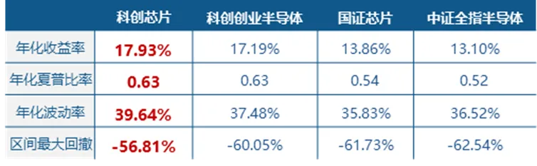 数据显示,截至2025年末,上证科创板芯片指数基日以来年化收益率达17.93%,略优于科创创业半导体、国证芯片、中证全指半导体等同类指数表现,同时最大回撤相对较小,风险收益比更好。