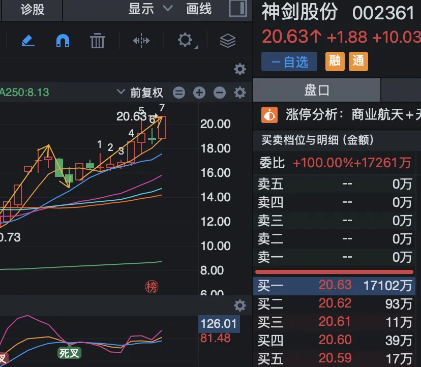 按周末分析的低吸了中国西电,估计错过了300的双杰电气,只能等下一波下杀低吸回来;今日市场高低切换迹象明显,光通信高位股资金流出,转而涌入商业航天板块。神剑股份的连续涨停有效激活了板块人气,带动了卫星卫通等个股集体走强。操作上,对顺灏股份和金信诺执行了冲高减仓,符合预判。明日需警惕日线级别的技术性回调风险,整体策略仍以持股或继续寻找低位机会为主,避免追高。