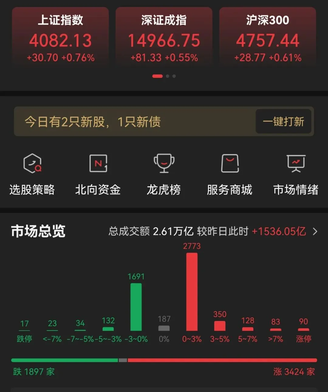 今天成交量达到2.6万亿,3000多家上涨,表明行情渐渐回暖,步入上升通道。