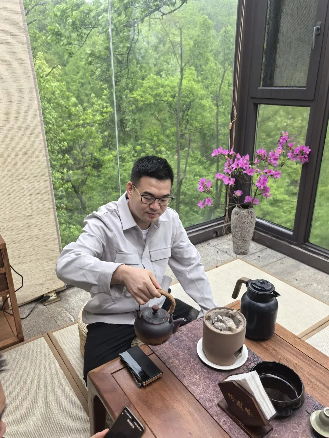 收盘后,受朋友邀约来到岳麓山饮茶。窗外绿意翻涌,雨声簌簌,心也跟着慢了下来。