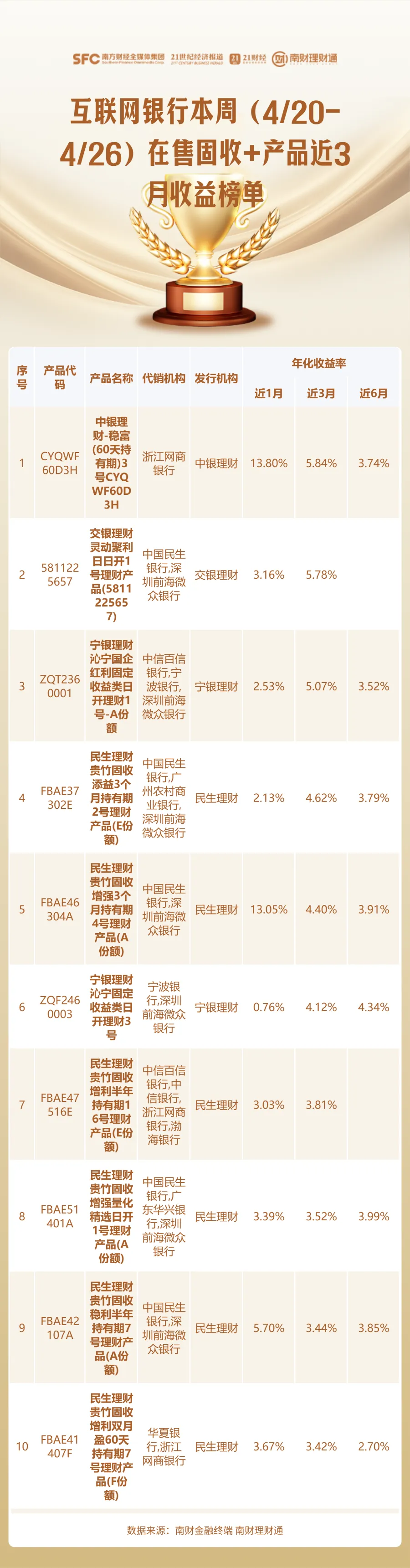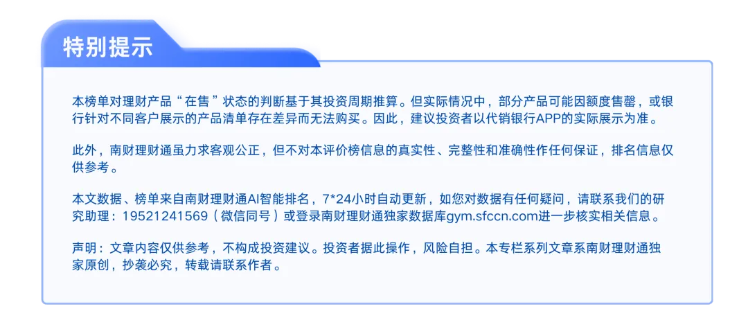 本期,课题组重点关注理财公司发行的混合类产品,从代销渠道为投资者筛选出表现较优的在售产品。收益数据统计截至2026年4月17日。