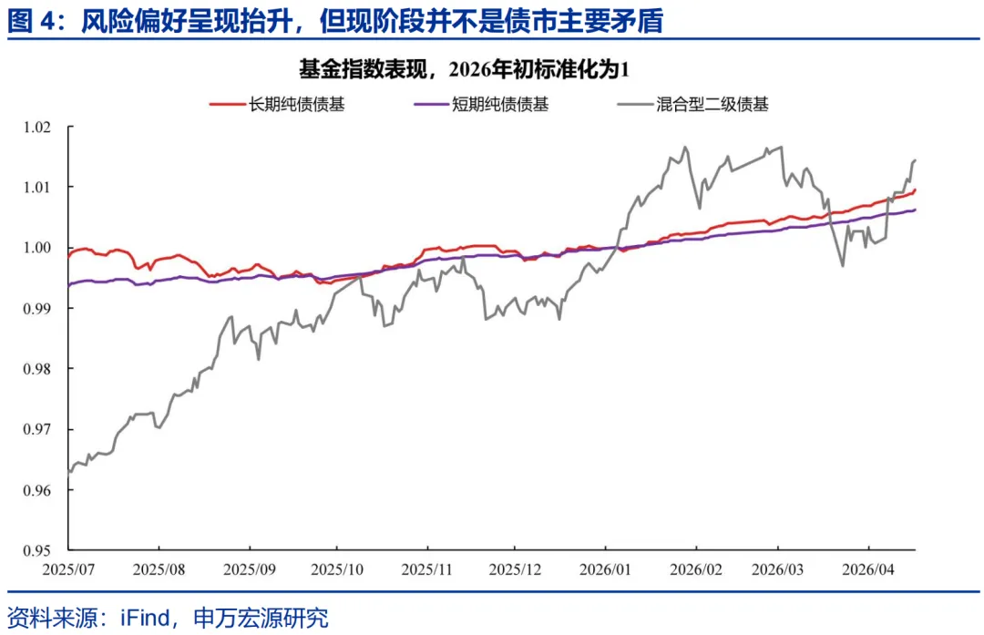 风险偏好仍在抬升,但并未成为影响债市的核心矛盾,久期策略回归高夏普比的优势。近期权益市场情绪有所回暖,风险偏好出现回升迹象,含权产品明显走强,但其对债市的影响并非当前阶段的核心矛盾。原因在于,流入权益市场的资金与流入固收市场的资金在来源和属性上存在明显差异,风险偏好回升对债市资金的分流效应有限,并未动摇“负债驱动资产”的主逻辑。当前阶段不宜因风险偏好阶段性回升就线性外推债市进入趋势性逆转阶段。